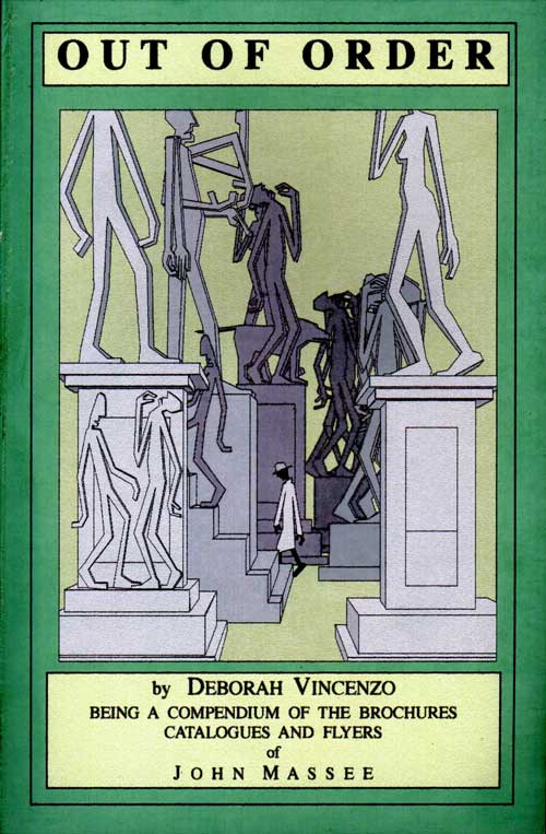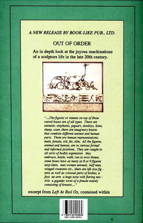 | A NEW BOOK by Deborah Vincenzo. Complete with all the latest Brochures, price lists and short books including, Gisco's Reply and, Left At Red Ox."....The figures or statues on top of these varied bases are of all types. There are animals; elephants, jaguars, donkeys, lions, sheep, oxen, there are imaginary beasts that combine different animal and human parts. There are human representations; male, female, old, fat, slim. All the figures, animal and human, are in various formal and informal positions. They are caught in all sorts of bodily expression they embrace, battle, walk, run in twos, threes, some bases have as many as 8 or 9 figures atop them, men women animals, half men, winged creatures etc., there are life size figures as well as colossal parts of bodies, a foot, an arm, a huge nose with flaring nostrils, a gigantic torso of a female mainly consisting of breasts...." An excerpt from Left At Red Ox. Brochures/Books may be ordered seperately, or get them all and more in the New Release, OUT OF ORDER | |